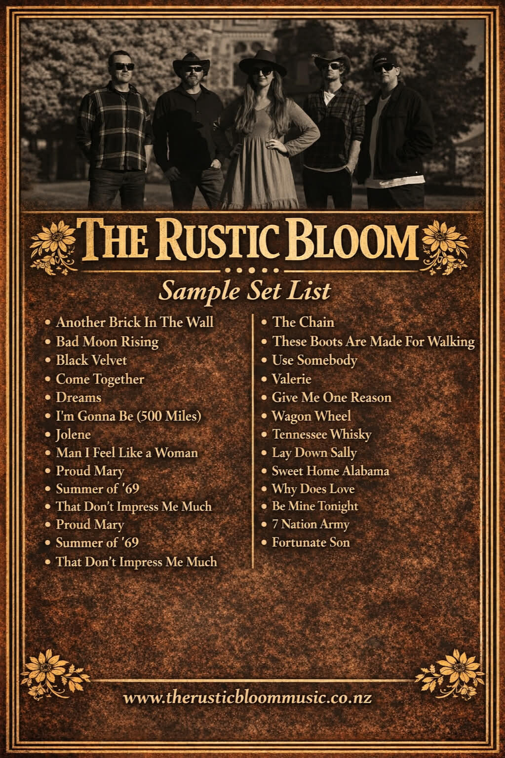 Your favourite hits, with a country twist. From laid‑back acoustic duo sets to a full, high‑energy band, we tailor our sound to suit your event, whether that’s smooth background vibes or full‑throttle party mode.